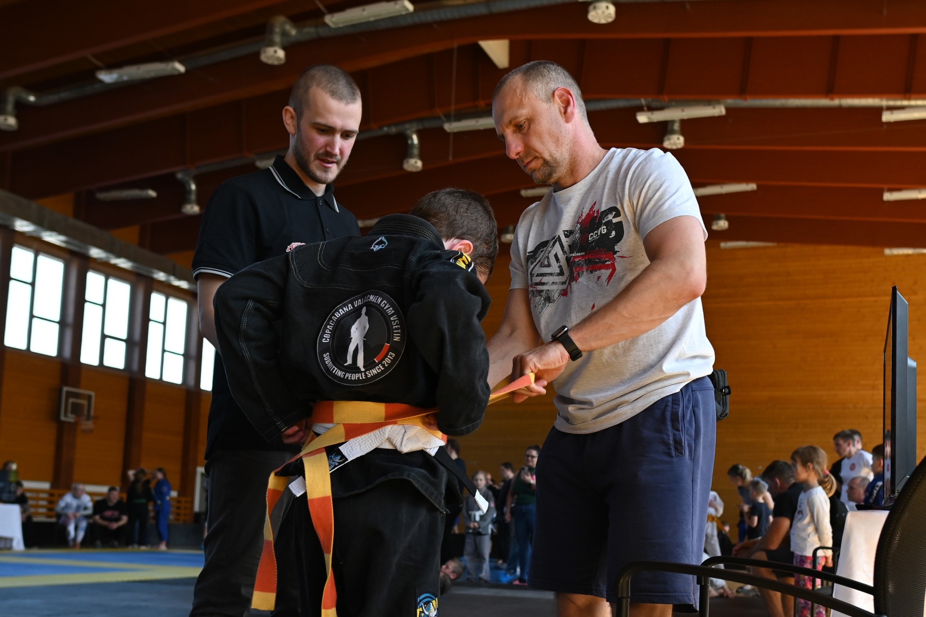 Na začátek stačí sportovní oblečení, doporučujeme dlouhé kalhoty, pak BJJ gi (kimono) – možné koupit přes oddíl